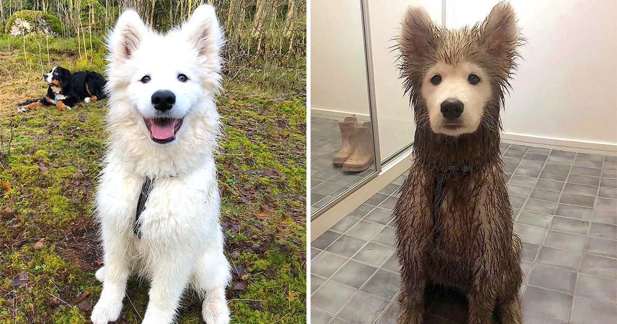純白小薩玩到「滿身泥回家」 站浴室還一臉無辜:我臉臉沒有髒喔~