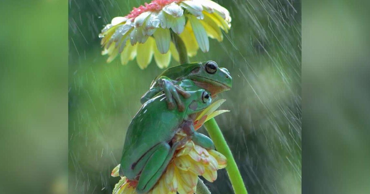 一起來躲雨!攝影師抓拍青蛙合作瞬間 花傘下「彼此相擁」網驚呼:好浪漫~