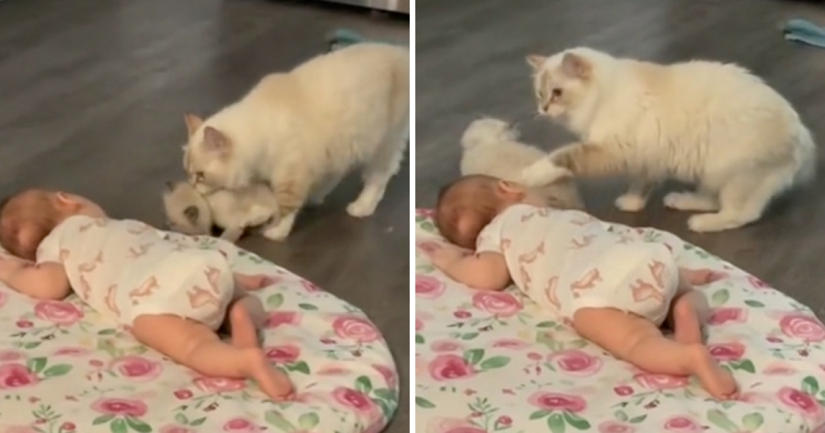 貓媽的堅持!叼小孩進屋「硬塞給寶寶」 嘴裡碎念介紹:以後要好好相處~