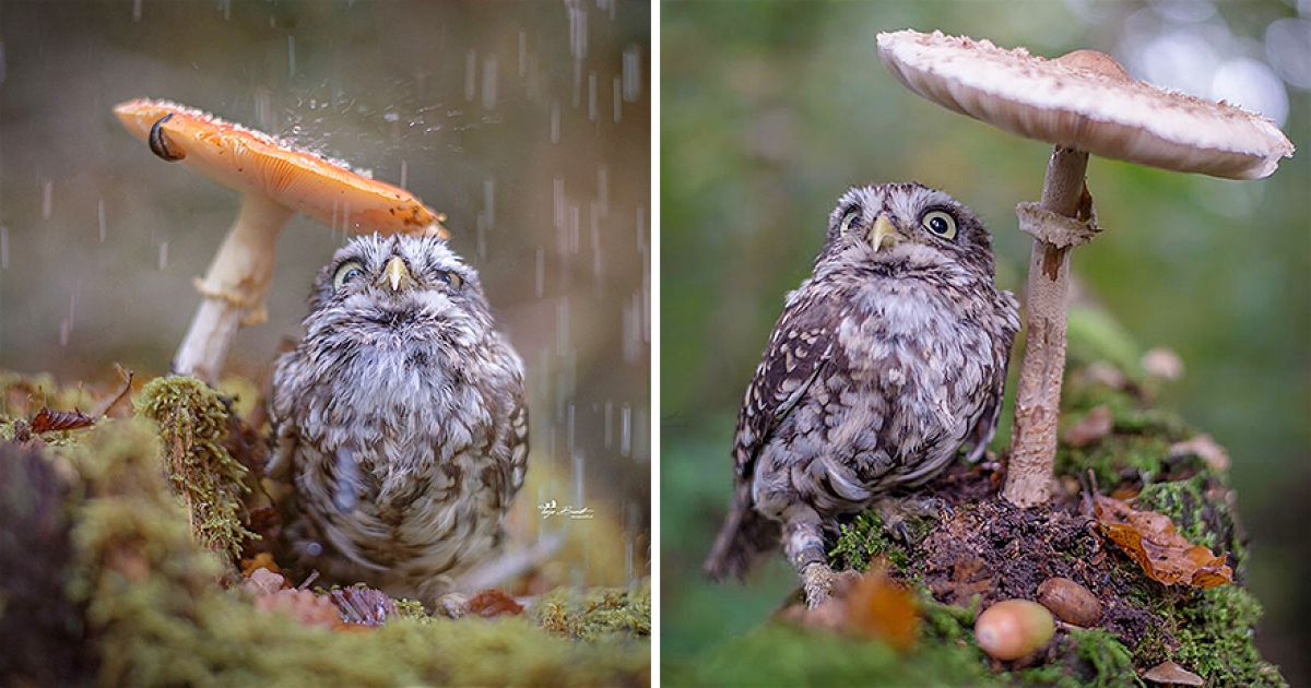 蘑菇下躲雨~貓頭鷹「大小眼」好享受 一臉萌表情:快點停雨啦