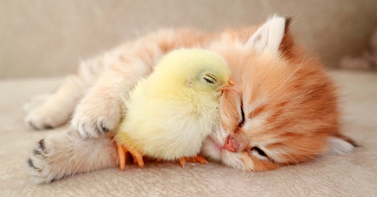 可愛的總和!小奶喵被介紹「朋友小雞」 2個隻秒混熟:抱一起睡搞搞❤️
