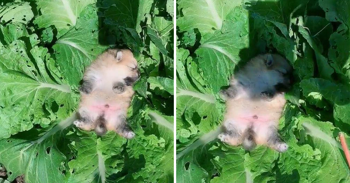 享受的極致!小奶狗陪主人摘菜「白菜上打呼嚕」 網笑:新品種「菜狗」?