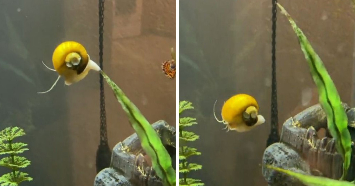 小螺在魚缸發現「自由落體」迷上了! 「爬水草跳下」一天玩好幾次:wee~