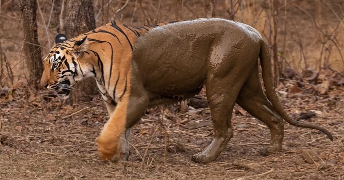 老虎爽洗泥巴浴消暑!起來「下半身失蹤」 網笑:巧克力脆皮?