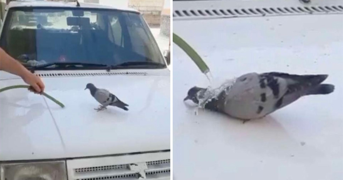 鴿子突降落引擎蓋不飛走! 他秒「心意相通」拿起水管:請沖涼~
