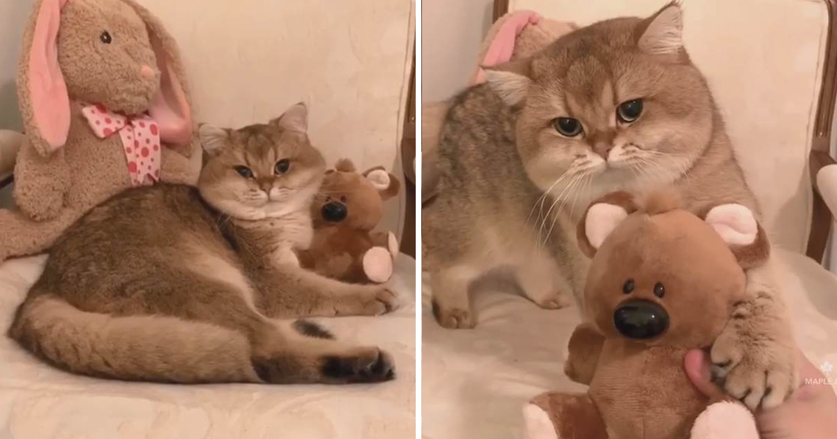 養到一隻戲精! 英短「太愛熊熊」全程緊抱 一被搶就用「無辜小眼神」萌抗議:還人家嘛~