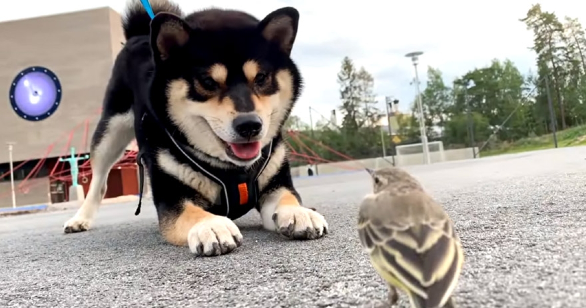 黑柴路上遇到小鳥超興奮! 秒蹲低「想秀鳥語」招呼:你好呀~