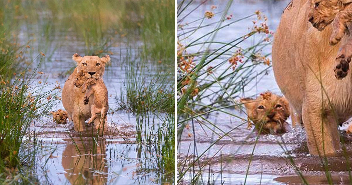 真的是親生的? 獅媽叼小獅子過河畫面超暖 網友眼尖發現亮點:馬麻等等我QAQ