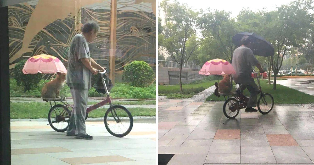 不愧是阿公的乖孫!下雨偶遇毛孩「撐粉紅小傘」 坐後座乖乖給阿公載♡