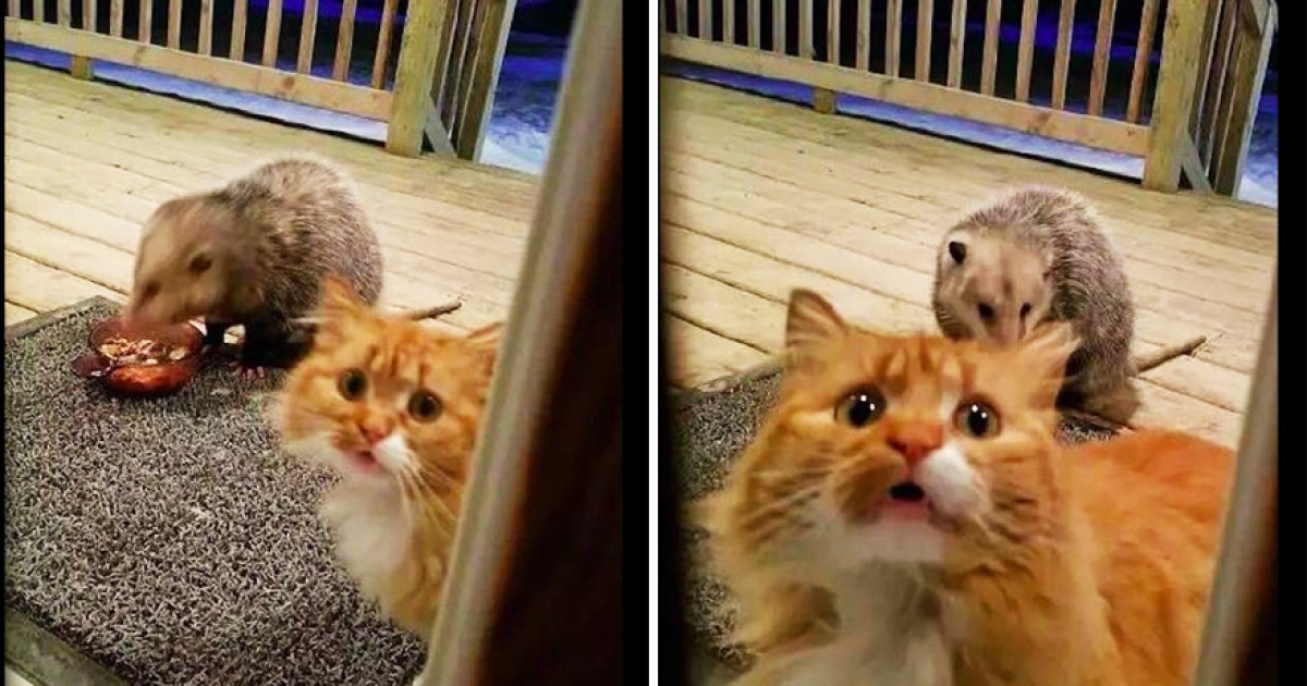 晚飯被負鼠搶走! 喵皇「嚇到軟綿綿」回頭滿臉委屈求救:媽,你看牠啦~