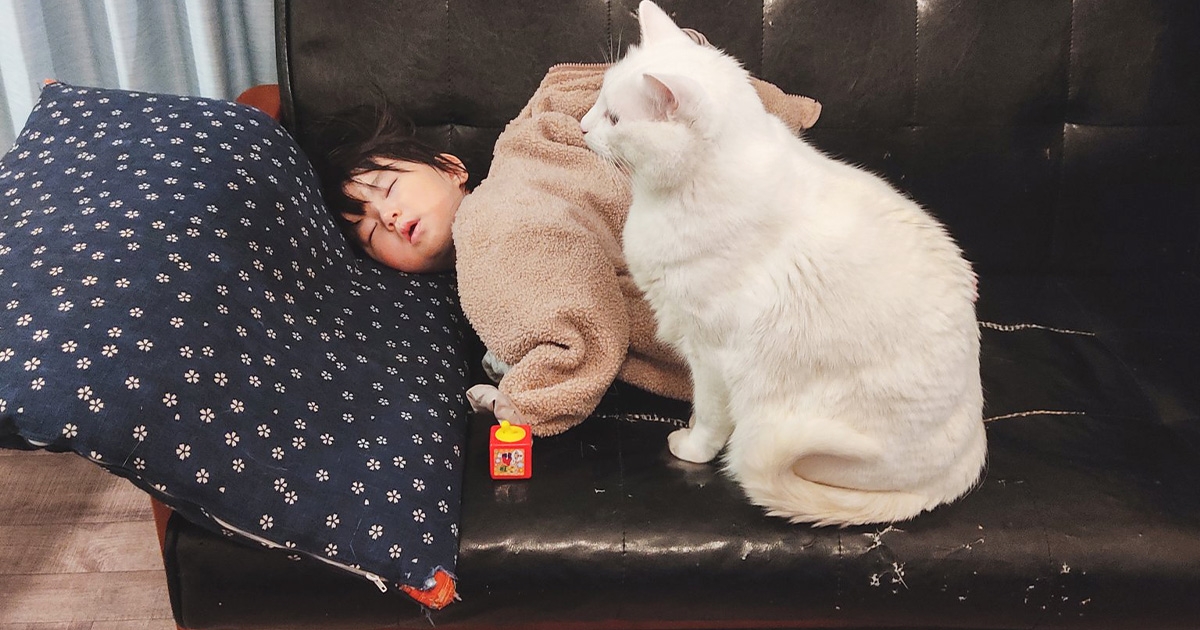 化身為護欄~ 白貓見小主人熟睡 默默到沙發邊緣守護:別跌下去囉