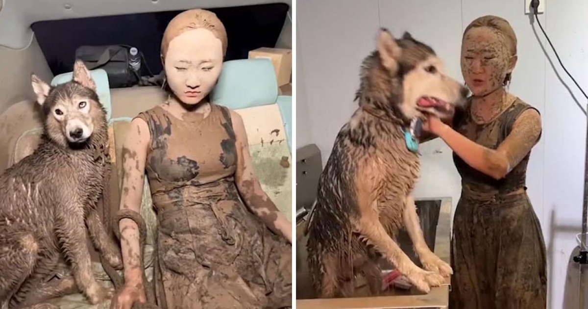 哈士奇不會讓人失望!散步太嗨「拉主人暴衝」 一起掉泥坑回家變兵馬俑