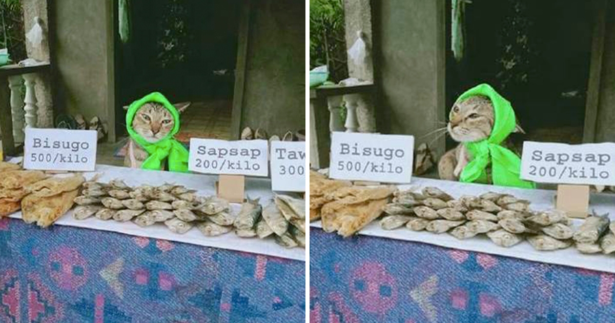 賣小魚乾攤販「竟然是貓咪」 戴綠色頭巾一副大媽樣:都來買喔!