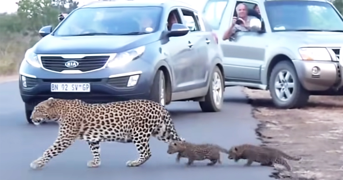 花豹媽帶2寶寶過馬路 「1隻突然軟腳掉隊」牠忙掉頭接:媽媽在這裡!