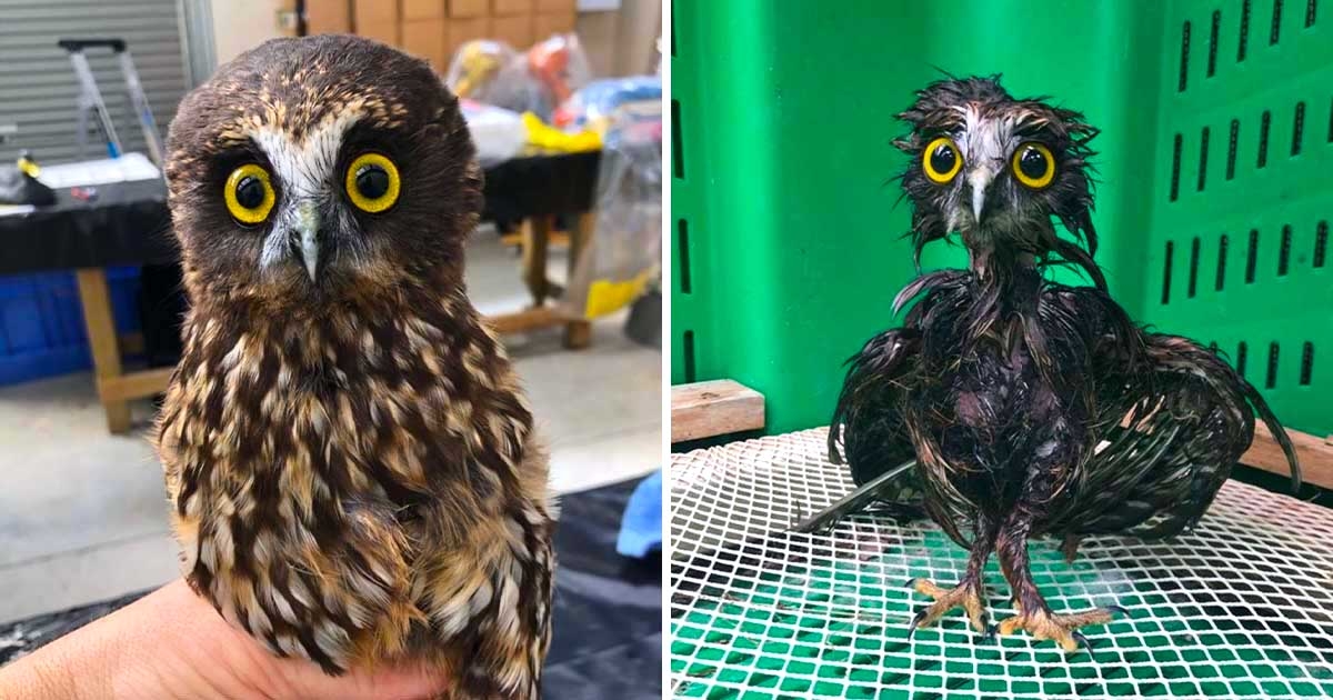 小貓頭鷹洗藥浴「消風變落湯雞」 怒瞪獸醫:把偶的衣服還來~