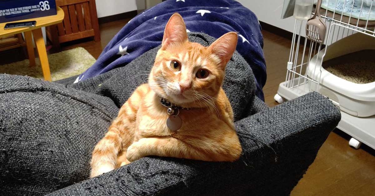 霸氣橘貓「手饋沙發」轉頭盯人 推主回家大傻眼:抱歉,打擾了