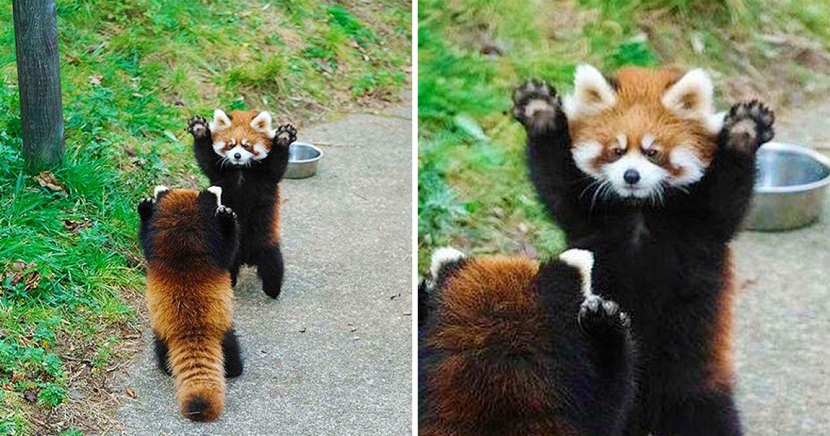 喝! 小熊貓突然「舉手手嚇同伴」 網笑翻:萌到好可怕❤