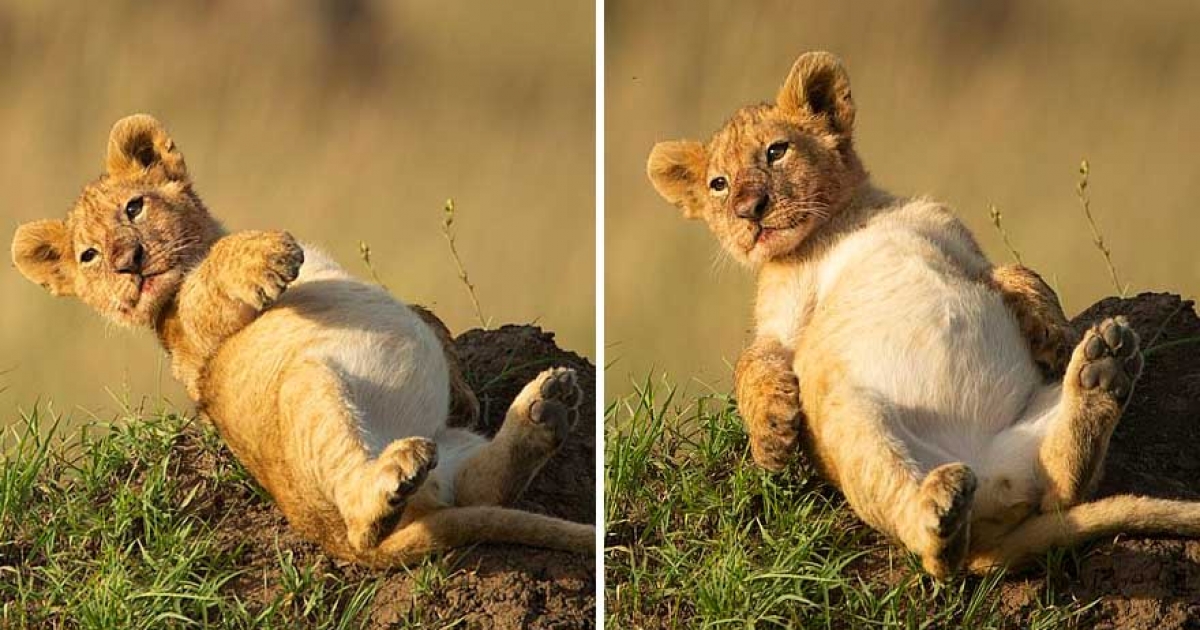 好享受! 小獅子吃完大餐「攤嫩肚曬太陽」 肥嘟嘟小腹讓人超想揉一把♡