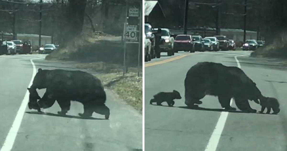 過個馬路好忙!「1打4熊媽」叼小熊過馬路 回頭好崩潰:泥怎麼又跑回來!