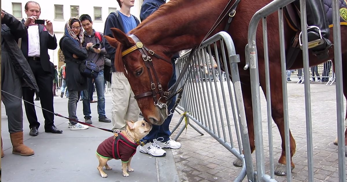 啾一個~ 法鬥首次見到「英挺警馬」 一見鐘情「最萌體型差」:親親照太有愛♡