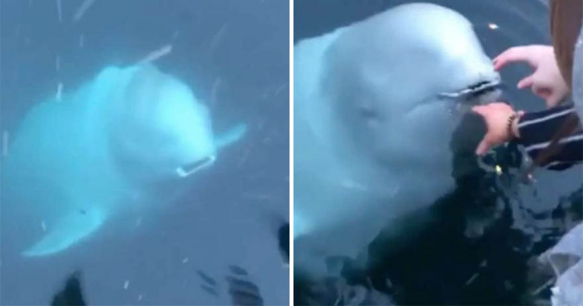 女遊客手玩手機掉入海! 小白鯨竟化身「湖中女神」撿回:這素是妳的嗎~