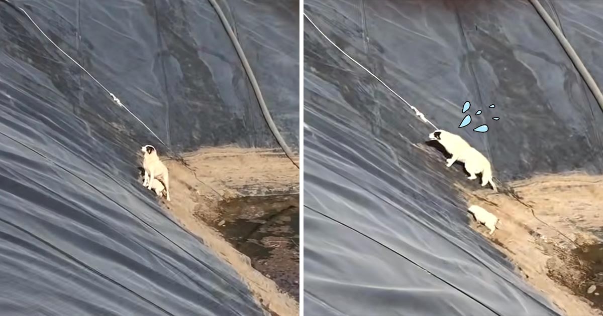 狗媽帶小孩「困陡峭池塘」怎樣都爬不上來! 好心人果斷滑下救援
