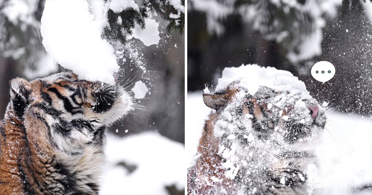 呆萌老虎仰頭「被雪砸臉」! 超Q反應融化網友:這就大貓R~