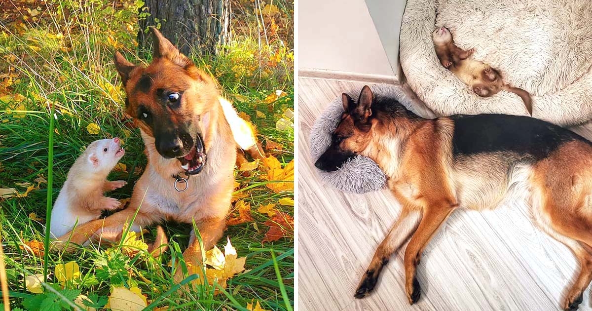 反差最大的麻吉! 一見鍾情的「大德牧&小雪貂」連睡覺都要睏作伙❤