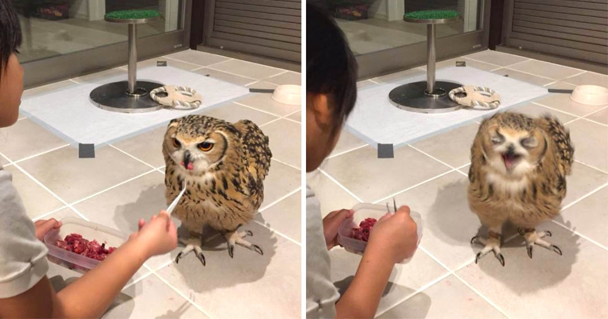 太美味了吧!冰山帥雕鴞吃肉肉 咬一口瞬間變「顏文字」:好吃到飛起~