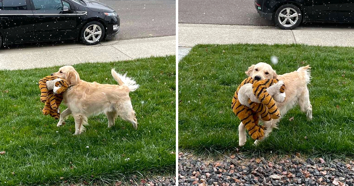 金金第一次看到雪太興奮! 還特地「叼起好友」衝庭院:好冰喔~