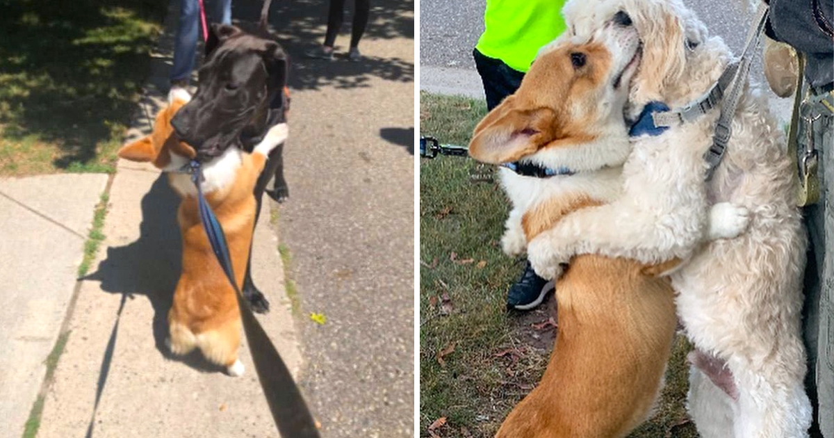 「很高興遇見你!」小柯基散步遇誰都要抱 見大丹犬「小短腿踮超高」