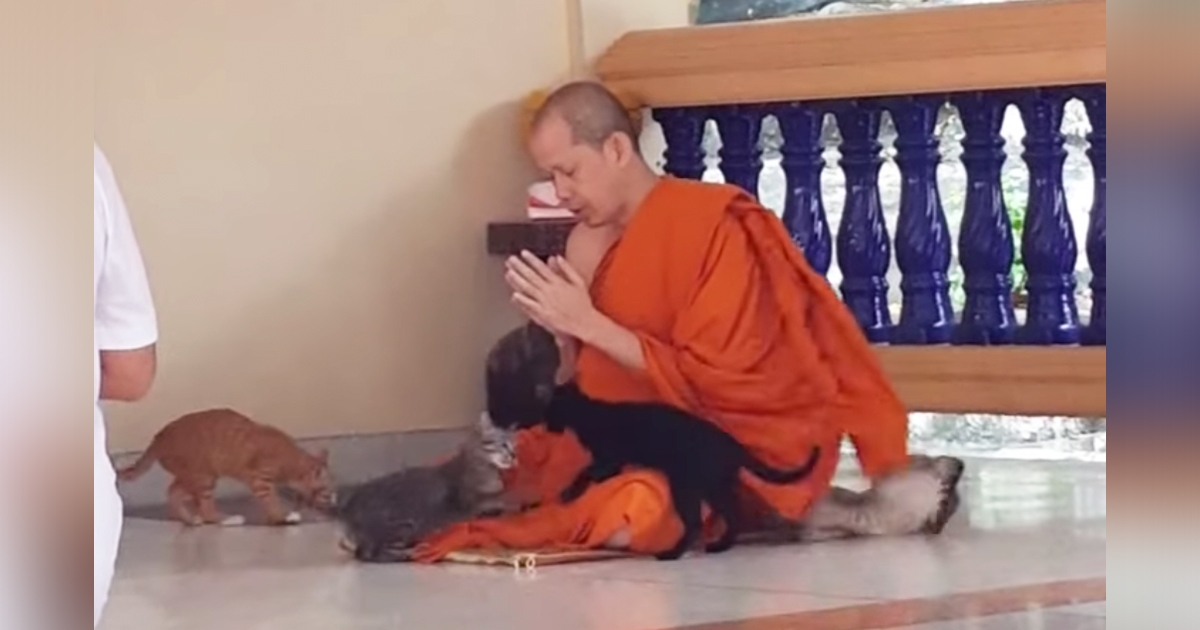 誦經被「4隻小P貓」蹭來蹭去! 僧侶努力「坐懷不亂」網笑翻:修行最大關卡~