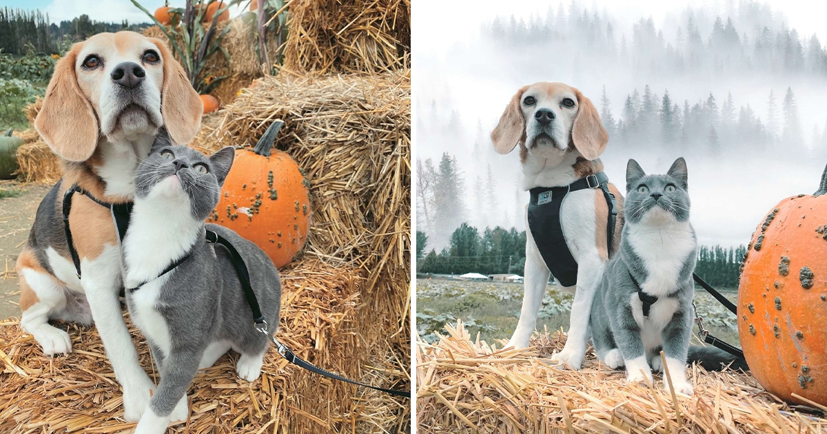 貓狗是好朋友!一起到南瓜園遊玩 兩隻黏緊緊站好:麻~幫我們拍照♡