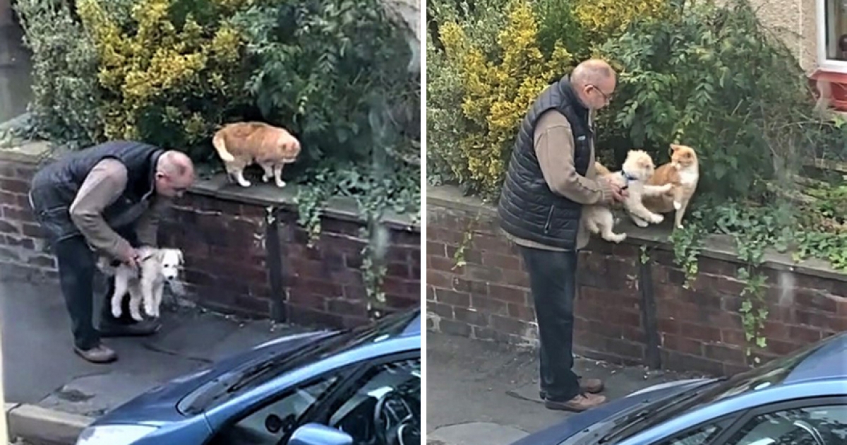 好可愛!老先生攜狗散步「偶遇鄰家大橘」 抱起來問:要不要認識一下呀~