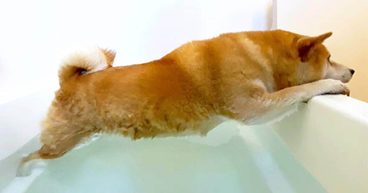 以全身拒絕!柴柴不想洗澡「棒式撐浴缸」 網笑翻:好強的腰力!