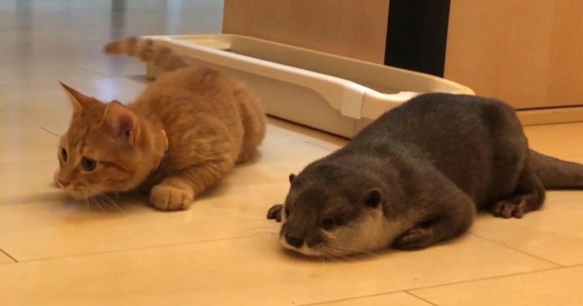 貓咪同化太強!水獺一起玩竟「越來越像貓」 兩隻搶逗貓棒同步趴:預備備~
