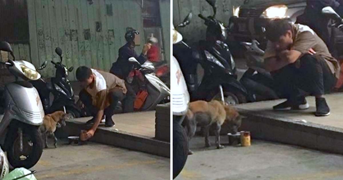 超溫柔!暖店員怕浪浪割到「倒入碗餵食」 原地抱膝守護牠:要吃飽喔~