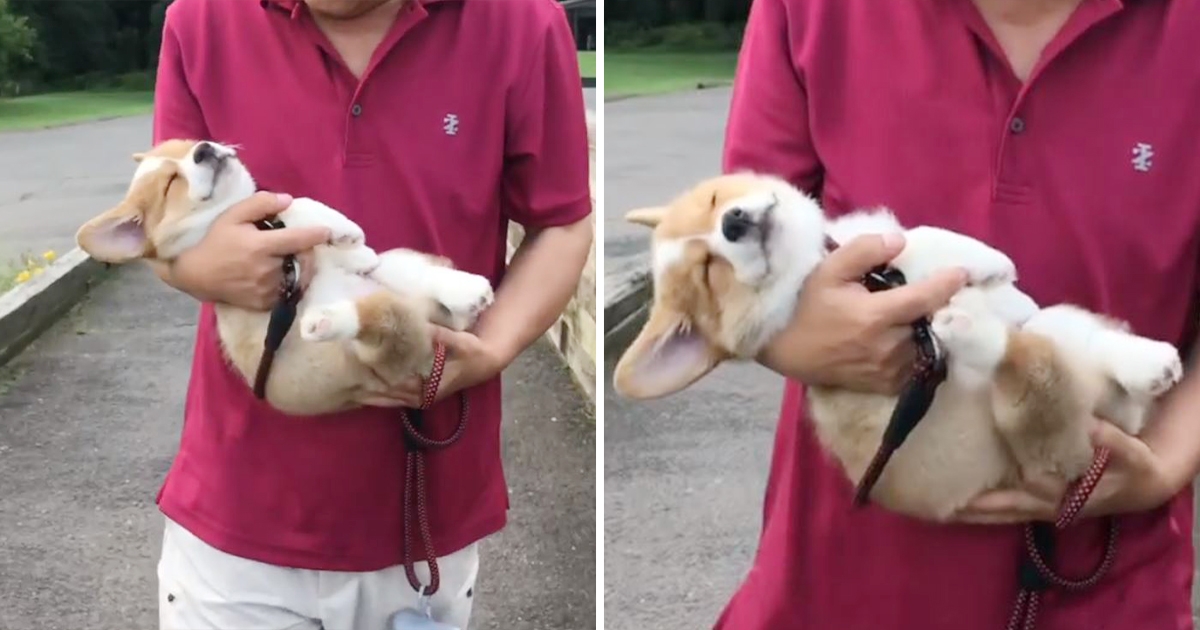 倫家走不動惹~ 柯基散步到一半「睡成一坨麻糬」 主人溫柔公主抱:這孩子太懶啦♥