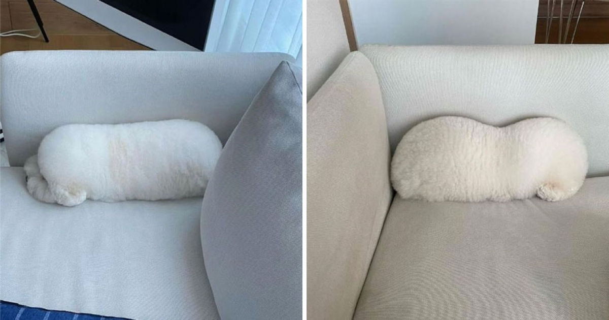 白色小狗「趴沙發」折腳腳酣睡! 渾身超蓬鬆一眼看去「還以為是個抱枕」