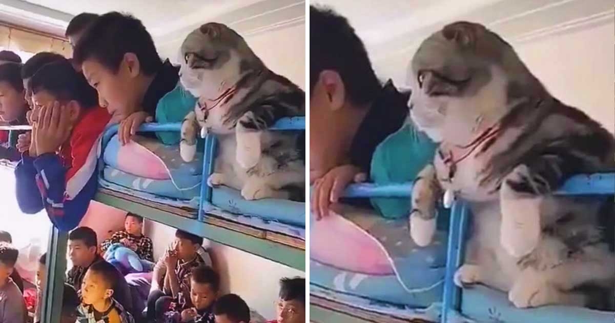 誰請的工讀生?小朋友住宿「貓貓跟著看電視」 爪爪搭欄杆好專注:演得超精彩~
