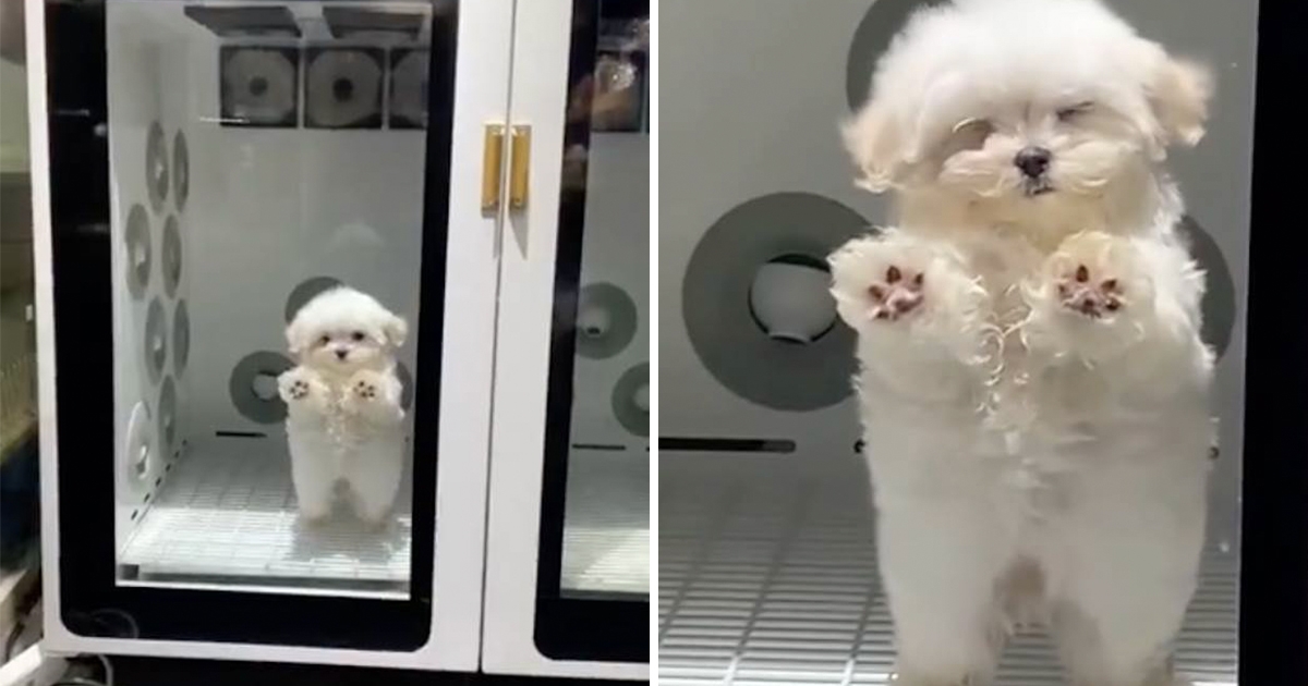 五告勾錐!小白汪初次進到吹風設備 急用「粉嫩肉球」扶門邊玻璃:風好大喔~
