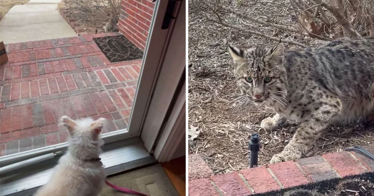 小嫩汪第一次「看到山貓」嚇得不敢動 原地「花半分鐘鼓起勇氣」挺身護主人:離我家遠一點!