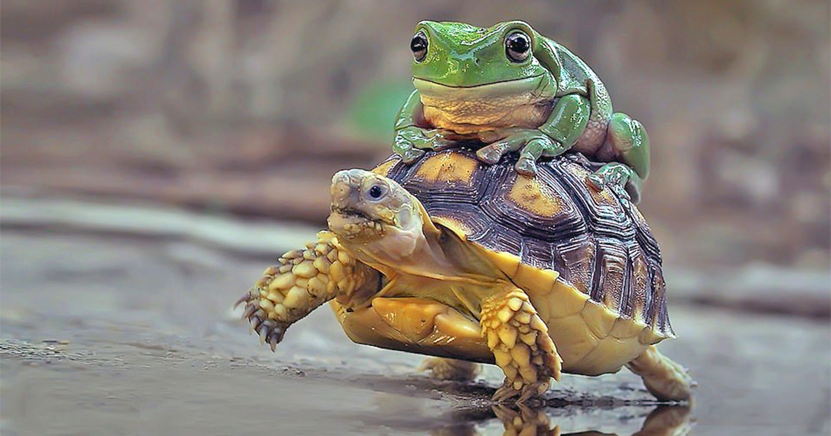 搭便車囉!巧遇偷懶蛙蛙「趴烏龜背」不跳了 兩隻超淡定:朋友一生一起走~