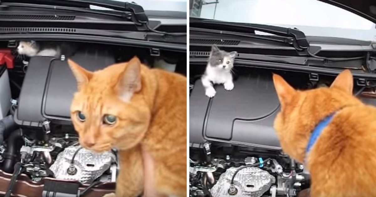 引擎蓋裡「躲小奶貓」怎樣都不出來 只好派鄰居大橘幫忙喊:裡面很危險!