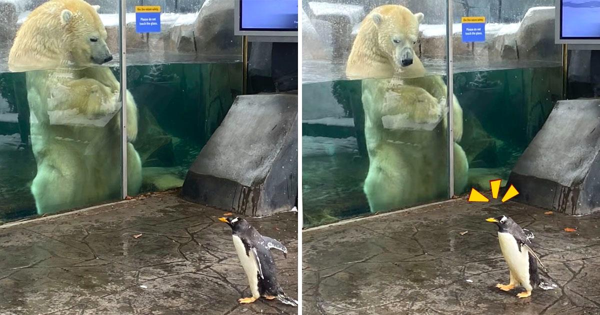 小朋友校外教學囉~ 下雪天企鵝們「搖擺外出」 看到北極熊驚訝:泥好大隻
