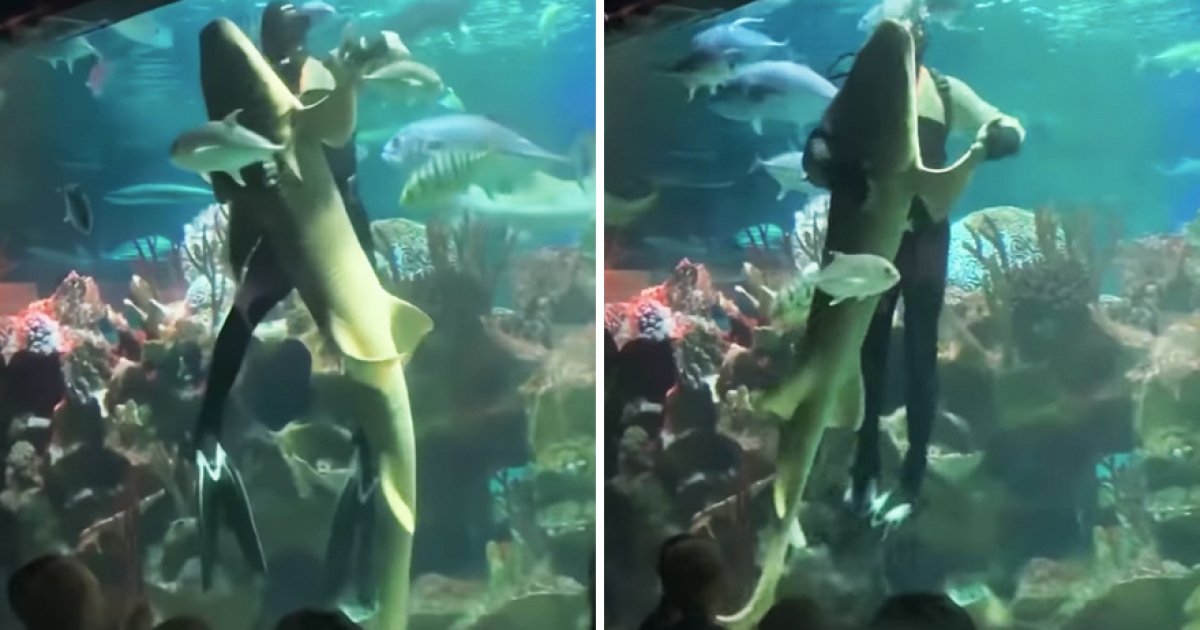 潛水員「拉鯊魚手手」貼身甜蜜熱舞 水族箱外觀眾看呆:太閃了吧!