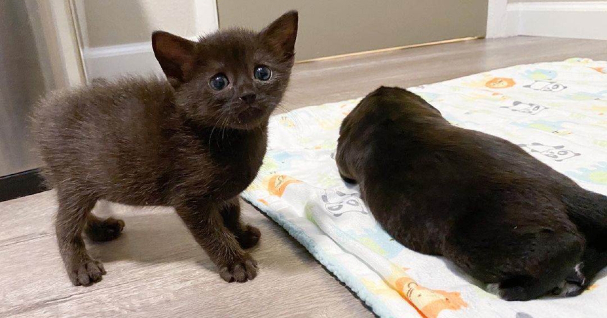 黑色小奶喵第一次見到「同色系小奶狗」 轉頭滿臉困惑:牠是貓咪嗎?