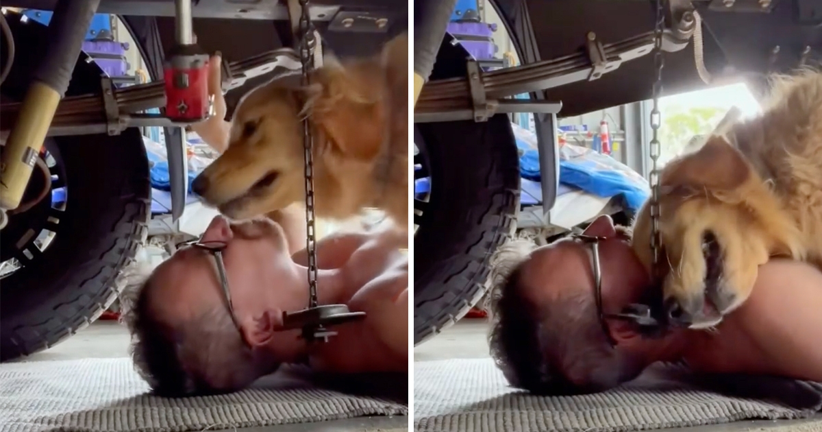 黏你到天涯海角!把拔在修車「阿金硬要鑽車底」 甜蜜索吻:快抱抱偶♡