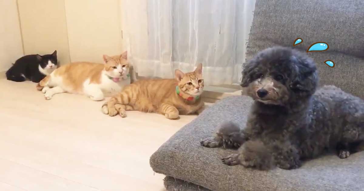 3隻貓後方「排排坐盯梢」 狗狗轉頭嚇一跳狂冒冷汗:皇上饒命!