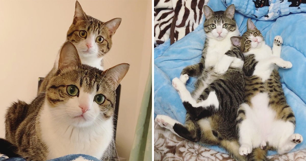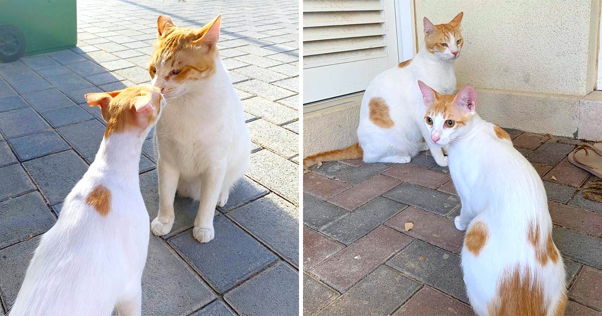 小橘貓偶遇「大一號的自己」 一臉疑惑碰鼻招呼:來自未來的偶?